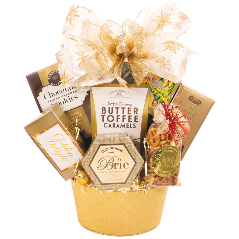 Shine bright this holiday season with a gift as radiant as it is delicious. Presented in an elegant gold metal bucket, this festive assortment is overflowing with gourmet treasures. Enjoy Focaccia Tuscan Style Crackers, Clair de Lune Brie Cheese Spread, and Smoked Almonds. For a touch of sweetness, indulge in Terzetto Bakery Chocolate Salted Caramel Cookies, Golden Delight Vanilla Crunch, The Buttery on Main Chocolate Chip Cookies, Gourmet Nut Snack Mix, and decadent Chocolat Classique Fine French Truffles. A golden gift that dazzles with holiday cheer and timeless elegance.