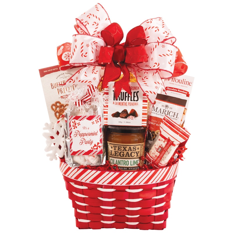 Bring the holiday spirit to life with this festive basket filled with peppermint favorites and savory delights. Inside, you’ll find Everton Toffee Butter Toffee Pretzels, Peppermint Saltwater Taffy, Tortilla Chips with Texas Legacy Cilantro Lime Salsa for a savory balance. Sweet indulgences include Dillon’s Peppermint Divinity, Marich Pancrafted Dark Chocolate Peanut Butter Pretzels, Pirouline Hazelnut Wafers, and Peppermint Crunch Truffles. A merry mix of flavors that makes every celebration feel like a peppermint party!