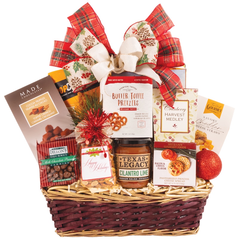 Perfect for sharing, this abundant basket is filled with sweet and savory favorites everyone will enjoy. Start with Texas Legacy Cilantro Lime Salsa and crunchy Tortilla Chips, paired with Focaccia Crisps Tuscan Style Crackers, and Mille Lacs Bacon & Chives Cheese Spread. Snack happily with Gourmet Nut Mix, Popcorners, and Savory Cheddar Cheese Straws, then enjoy a touch of fruit and crunch with the Cranberry Harvest Medley and Butter Toffee Pretzels. For a sweet finish, indulge in Made Chocolates Toffee Crunch Cocoa Truffles and Dillon’s Gourmet Milk Chocolate Peanuts. A festive assortment made to delight any group!