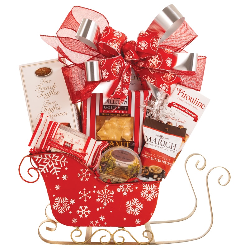 Hop aboard this festive snowflake–embossed decorative sleigh, overflowing with sweet and savory treats that are sure to delight! Inside, they’ll discover Chocolat Classique Fine French Truffles, Marich Pancrafted Dark Chocolate Peanut Butter Pretzels, Dillon’s Gourmet Peanut Brittle, Dillon’s Peppermint Divinity, and Pirouline Chocolate Hazelnut Crème Filled Wafers bring festive cheer, while savory Focaccia Crisps Tuscan Style Crackers with creamy Northwoods Cheddar Cheese Spread round out this merry collection. Perfect for gifting—or sleighing your way into someone’s heart this holiday season!