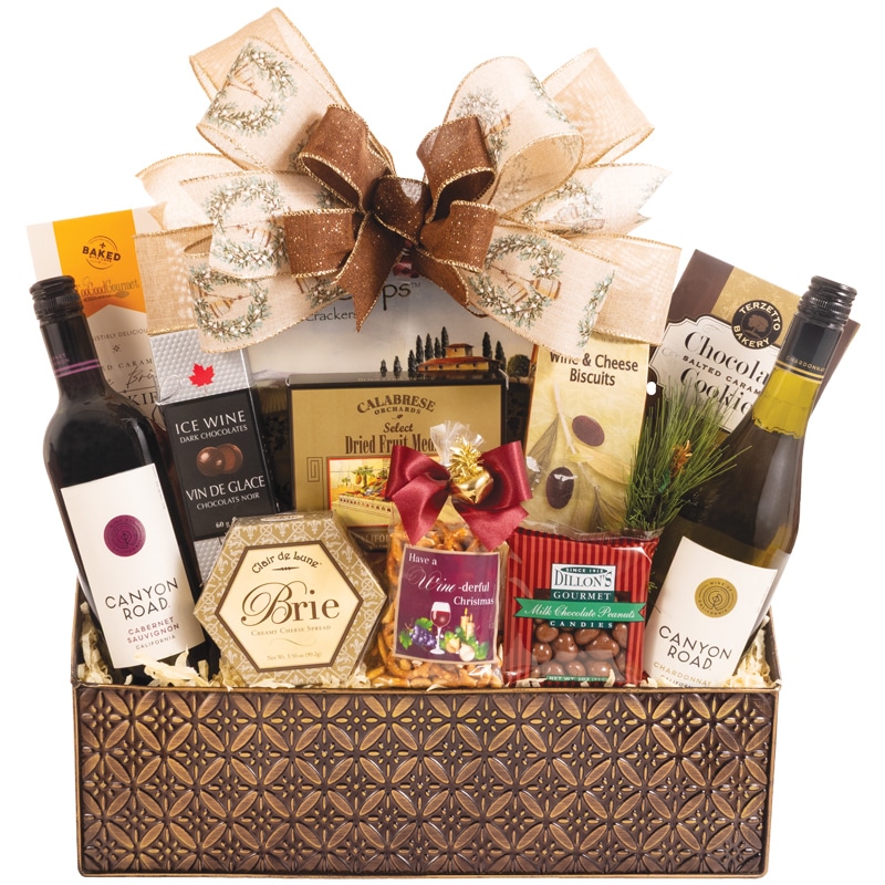 A holiday favorite, this timeless gift basket pairs the elegance of wine with the comfort of gourmet treats. Inside a luxurious container, they’ll discover two bottles of Canyon Road Wine—one red and one white—perfect for celebrating the season. To complement the wines, we’ve included Focaccia Crisps Tuscan Style Crackers, Clair de Lune Brie Cheese Spread, Los Olivos Wine & Cheese Biscuits, Gourmet Nut Snack Mix, Calabrese Orchards Select Dried Fruit Medley, Dillon’s Gourmet Milk Chocolate Peanuts, Made Chocolates Ice Wine Dark Chocolates, Terzetto Bakery Chocolate Salted Caramel Cookies, and Too Good Gourmet Salted Caramel Crème Brûlée Cookies. A classic collection designed to impress, share, and celebrate the joy of the holidays.