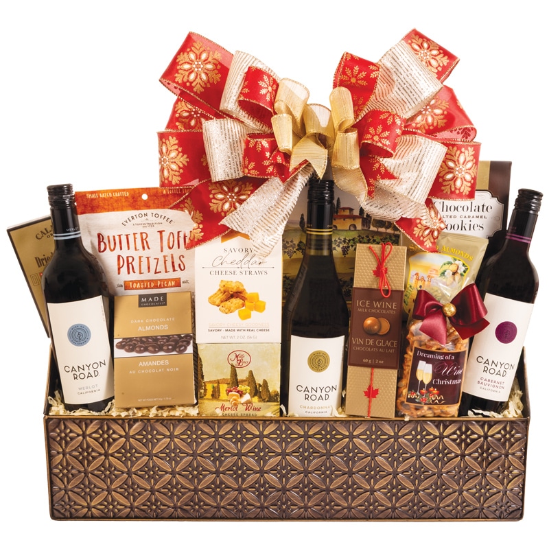 Elevate the season with this elegant metal planter filled with gourmet indulgences. Savor Calabrese Orchards Select Dried Fruit Medley, Everton Toffee Butter Toffee Pretzels Toasted Pecan, Made Chocolates Dark Chocolate Almonds, Smoked Almonds, Too Good Gourmet Savory Cheddar Cheese Straws, Mille Lacs Merlot Wine Cheese Spread, Focaccia Crisps Tuscan Style Crackers, Made Chocolates Ice Wine Milk Chocolates, Dreaming of a Wine Christmas Gourmet Nut Snack Mix, Terzetto Bakery Chocolate Salted Caramel Cookies, and a trio of Canyon Road wines—Cabernet Sauvignon, Chardonnay, and Merlot.